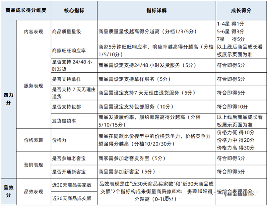 2. 商品成長(zhǎng)分結(jié)構(gòu)煥新:成長(zhǎng)總分由“四力分”(內(nèi)容、服務(wù)、價(jià)格、營(yíng)銷表現(xiàn)之和)與“品效分”(品效表現(xiàn))共同構(gòu)成。