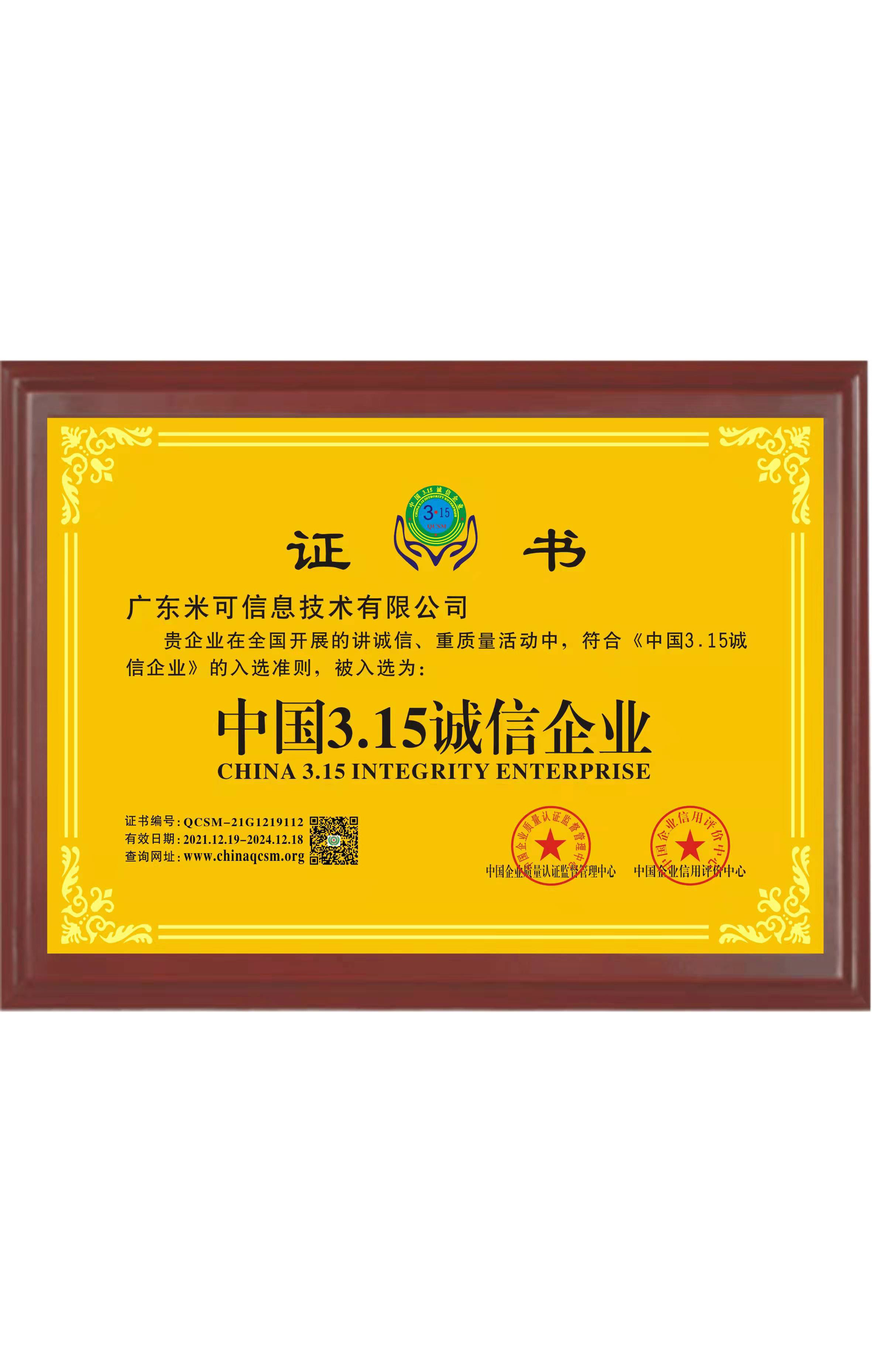 中國3.15誠信企業證書
