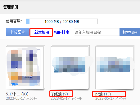 新建相冊,分PC端和無線端,將準(zhǔn)備好的圖片上傳到圖片空間里,后續(xù)都是從這里找圖片地址