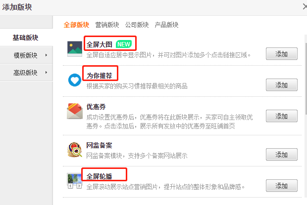根據(jù)自己的選擇添加自己需要的板塊,一般建議順序(全屏輪播3張——全屏大圖)