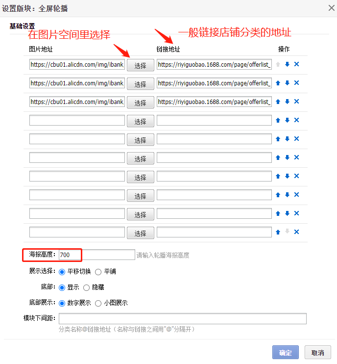 1、全屏輪播——在圖片地址選擇需要上傳的圖片,如果圖片帶有產(chǎn)品分類,可鏈接店鋪分類的地址,一般海報(bào)高度建議700
