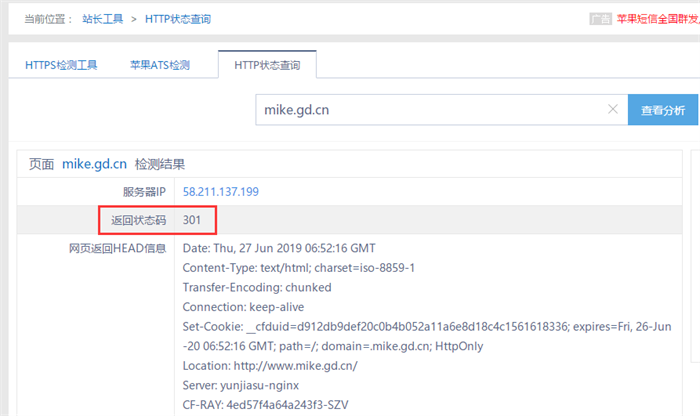 如果為301,說明這個網站是有做301重定向的,否則就是沒有。