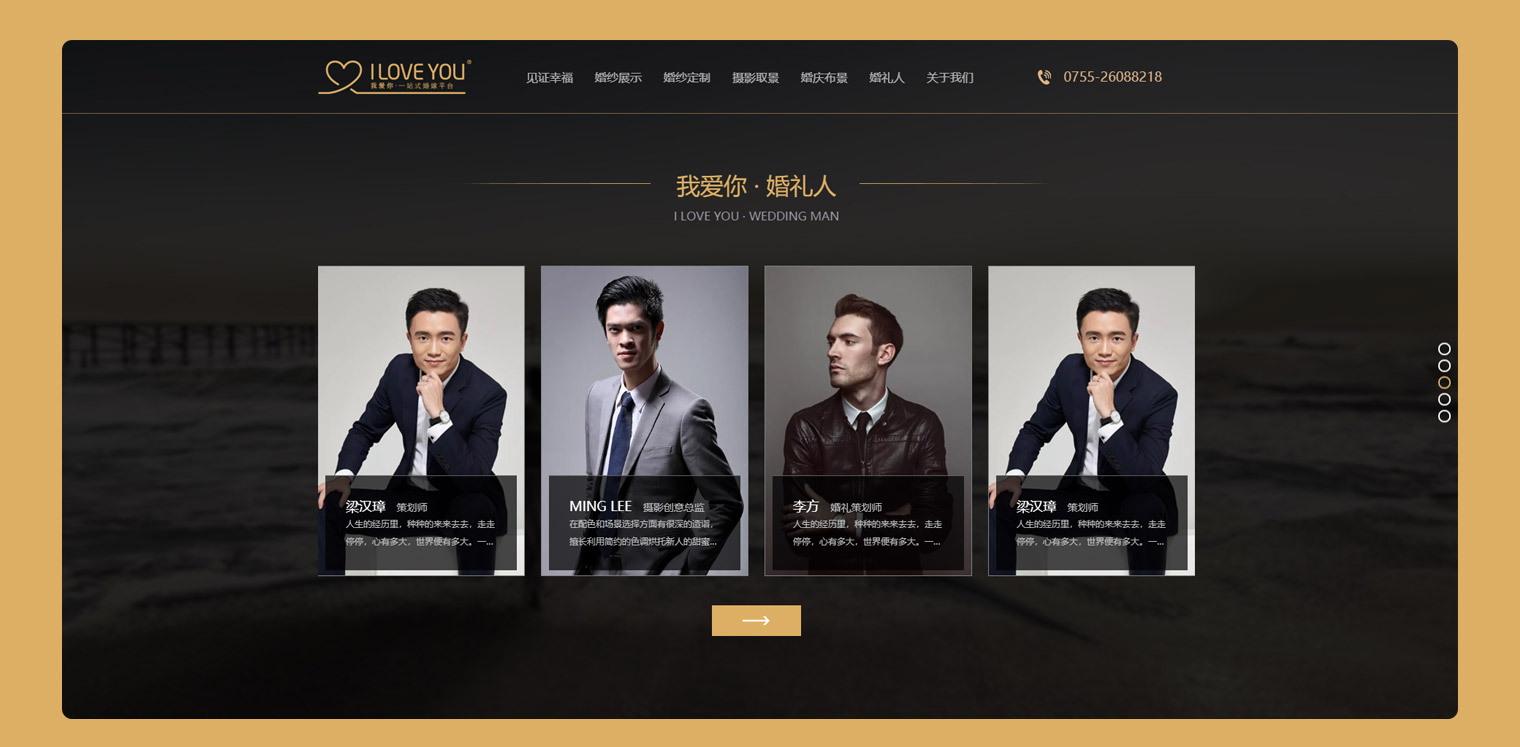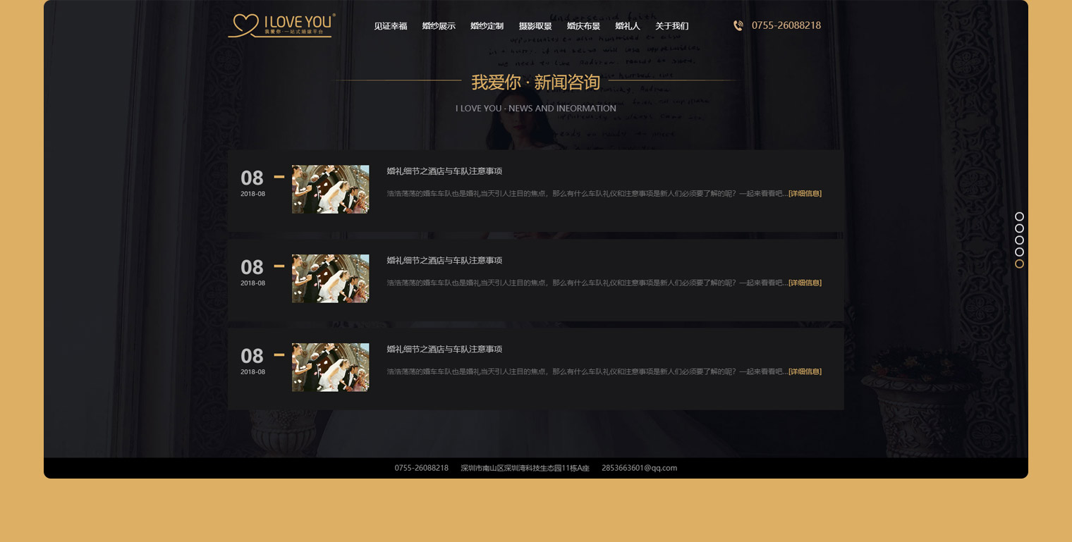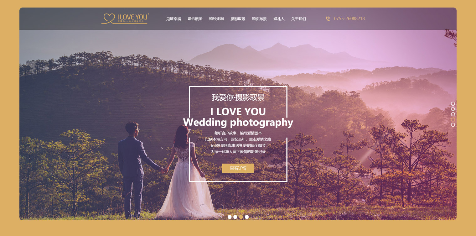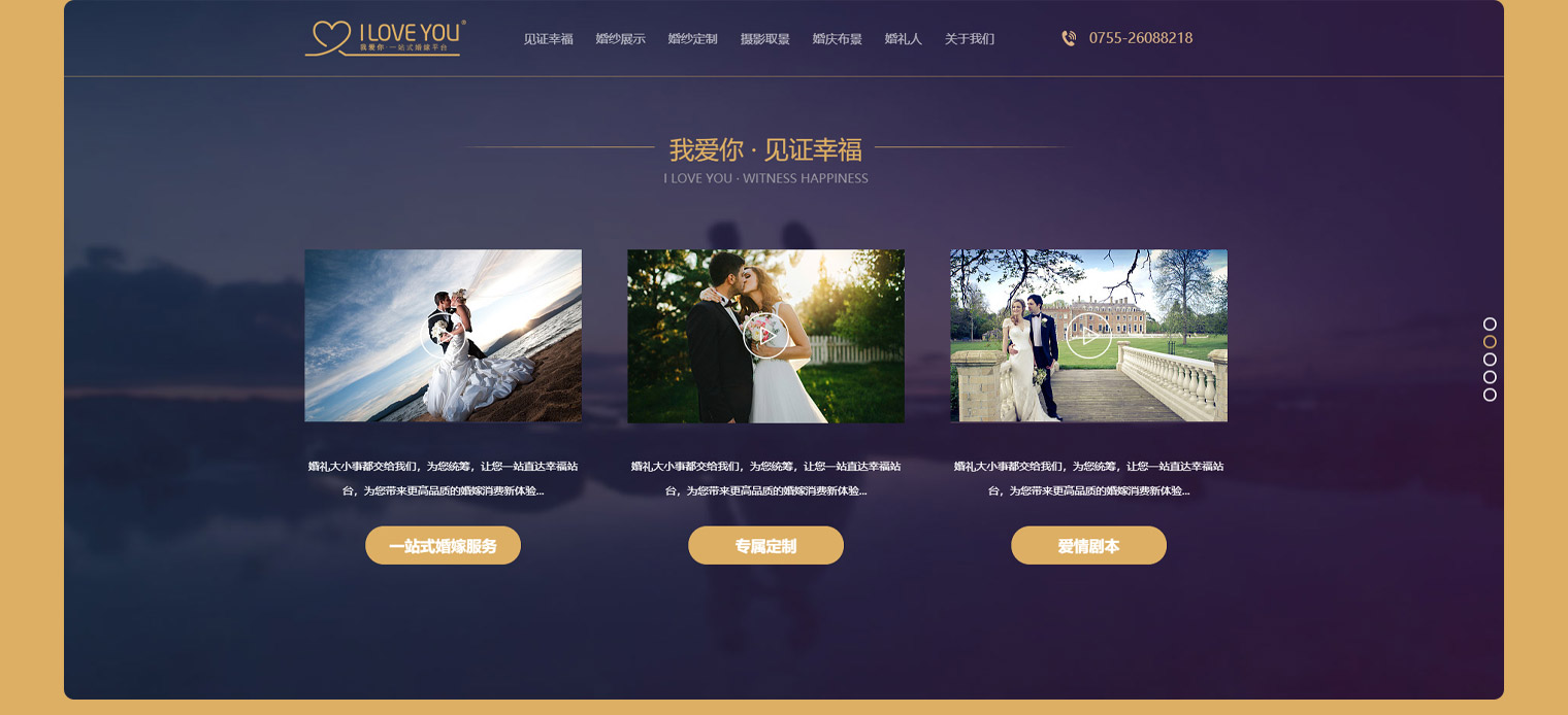 深圳我愛你婚紗集團有限公司的品牌網站建設,通過對網站的布局,背景圖片,色彩,圖標,圖片在設計師的手上完美融合,體現出拍婚紗照的幸福,浪漫的氛圍,展示出以精湛的產品、貼心周到的服務為當代消費者提供各類高品質婚紗、策劃定制 服務,全面覆蓋婚紗定制、婚紗攝影、婚慶策劃、婚慶用品等多個方面的業務。
