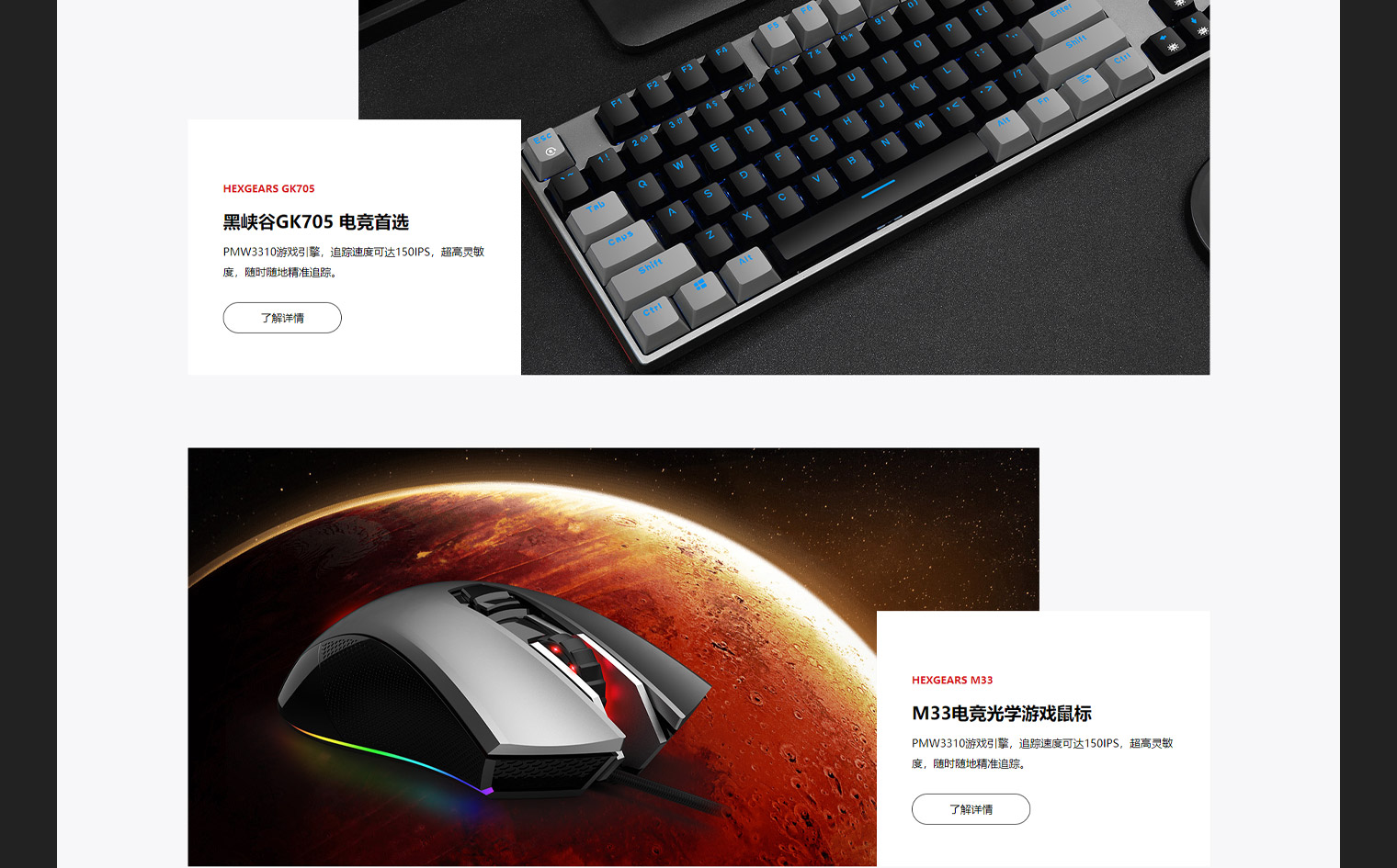 黑峽谷(HEXGEARS)-電競電子產品研發、生產、銷售為主,通過網站建設提升公司品牌影響力及產品展示,結合行業特性(科技感、游戲特色、品牌理念)及客戶關注點(性能、炫酷)對產品進行了獨立設計,每款產品結合定位進行獨立營銷單頁設計,以突出產品的性能及科技感,采用扁平化設計風格融入產品設計的理念,使整個頁面設計獨具特色。