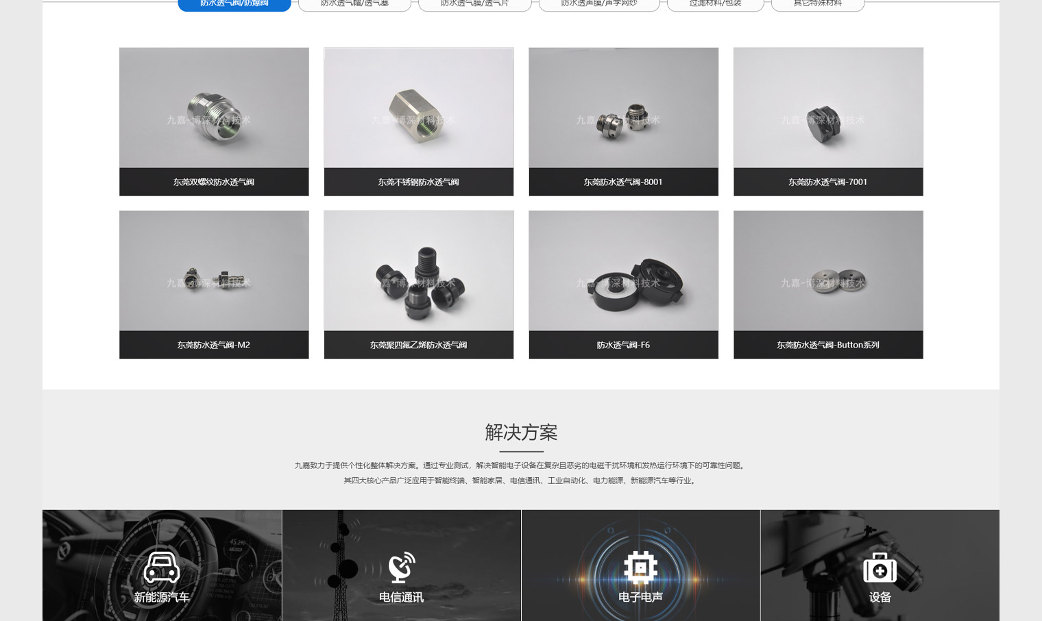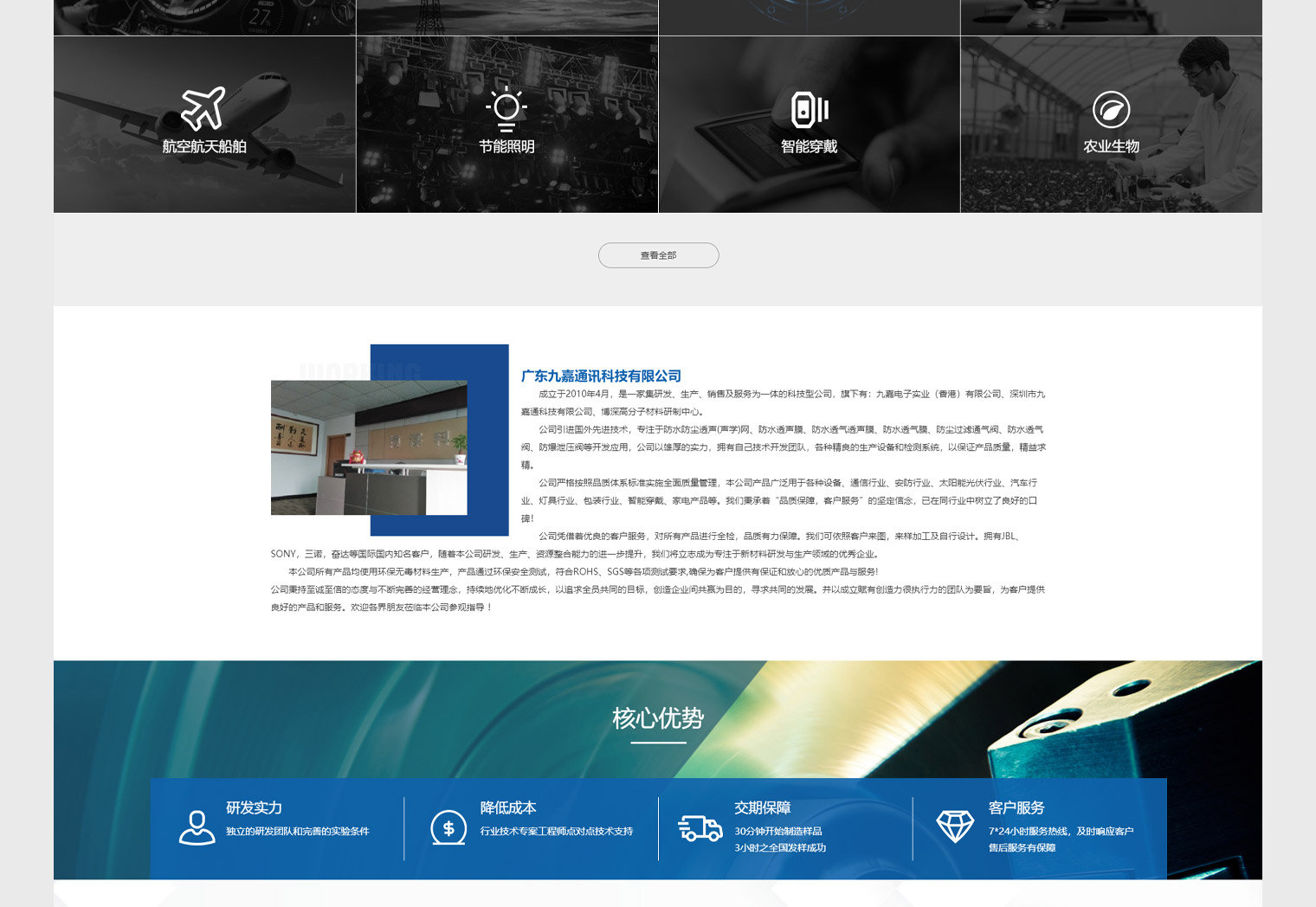 九嘉通信以防水材料為主,產品應用行業廣泛,網站建設結合推廣需求及客戶轉化率對網站整體進行內容布局設計,進入網站以各類型產品為主(選項卡切換)解決客戶需求問題,同時引導客戶對應行業應用進行說明,突出了公司的特色優勢:制造業的交期、產能、研發及品控;網站設計上采用寬屏設計,突出科技感。