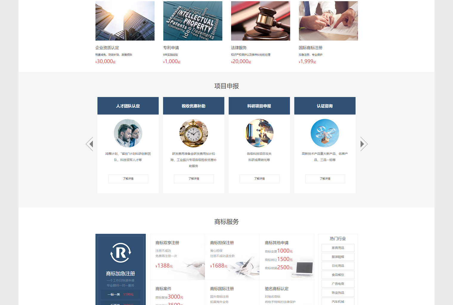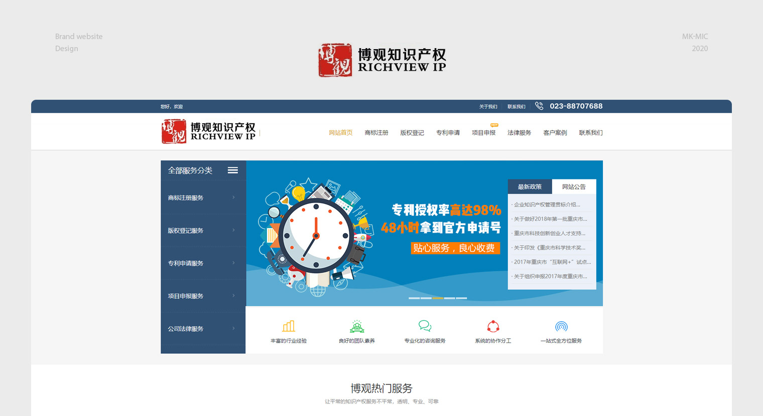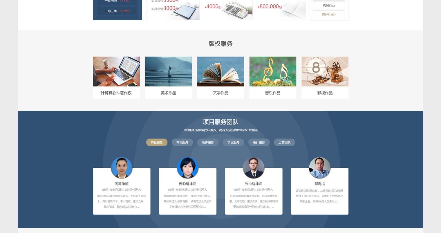博觀是一家專業提供咨詢產權服務的公司,網站建設重點展示以商標、專利、版權、項目申請、法律服務等,網站內容重點在于各項服務的流程介紹,讓客戶有需求的情況下更多的是關注應該準備什么?流程是什么?以此來突出博觀的專業及經驗。