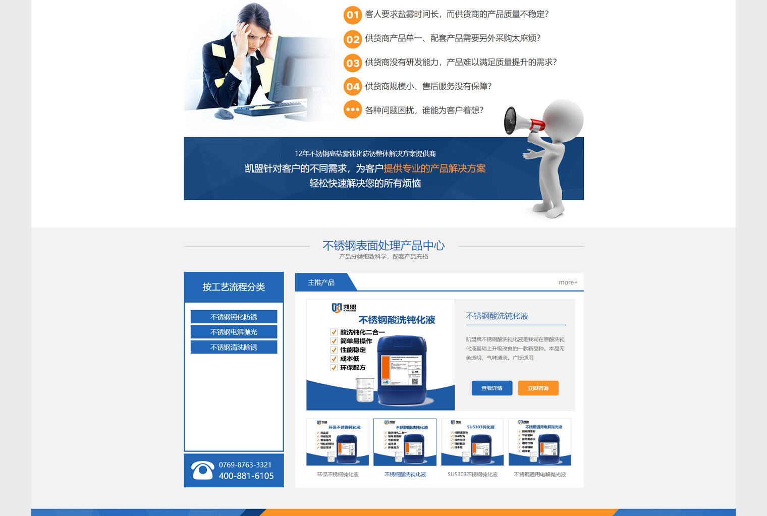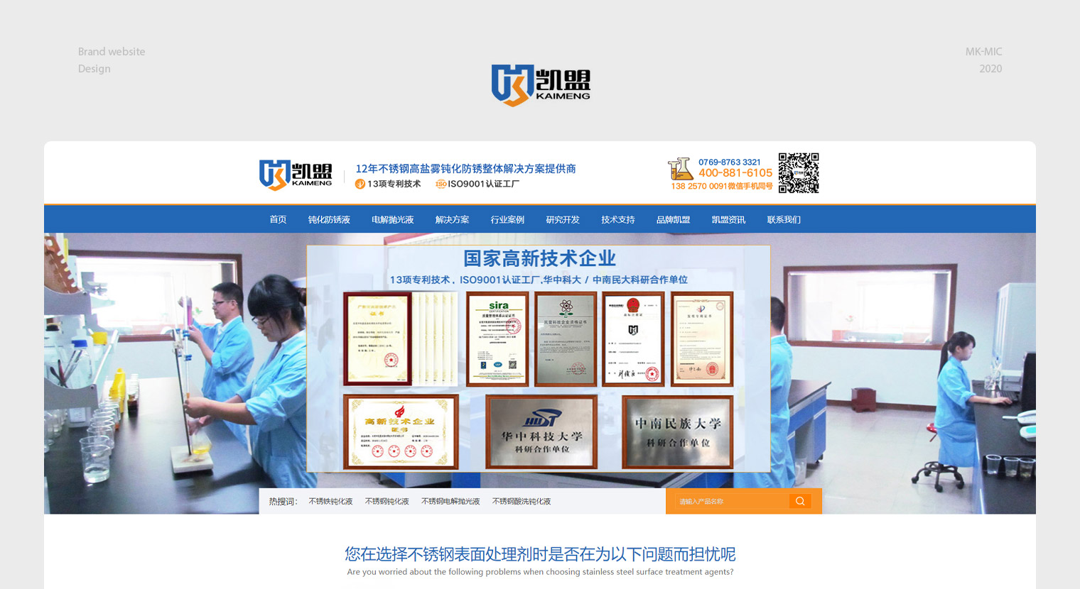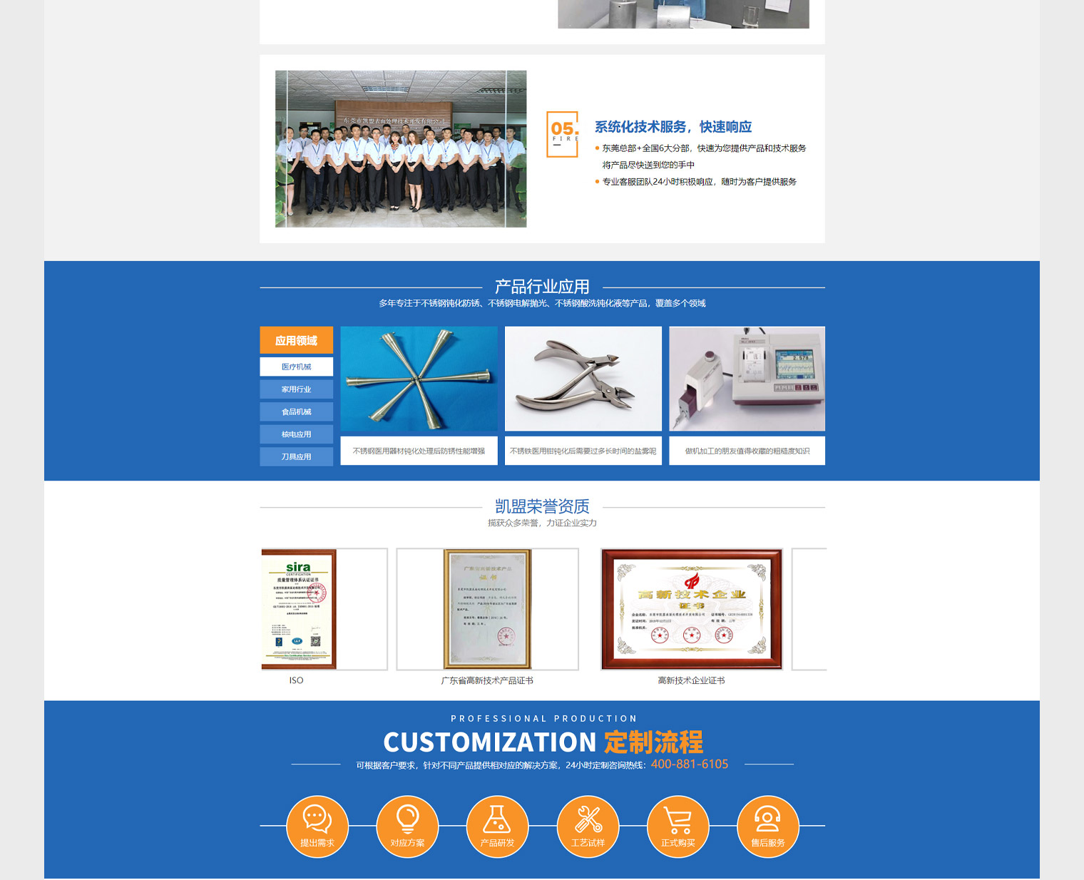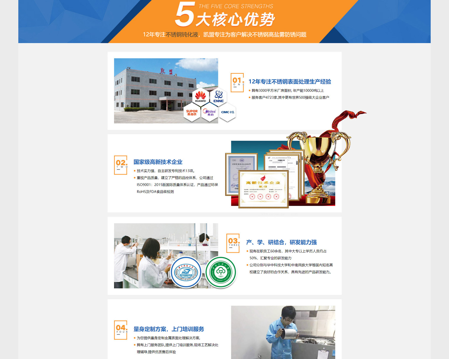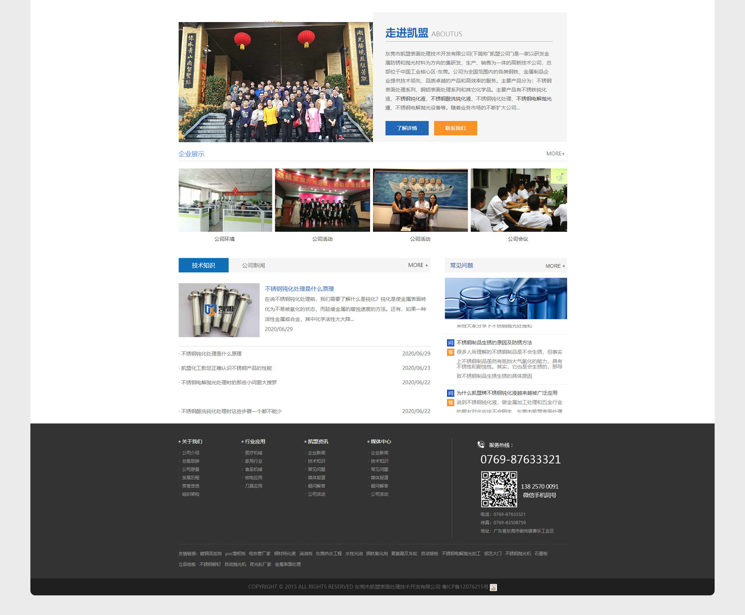 東莞市凱盟表面處理技術開發有限公司是一家以研發金屬防銹和拋光材料為方向的集研發、生產、銷售、服務為一體的高新技術公司,且12年研發、生產經驗,擁有完善的檢測設備及與各種儀器及專業的管理人員。藍綠主色調對比搭配符合行業調性同時讓整個網站顯得干凈大氣。更符合網站銷售產品的視覺效果。